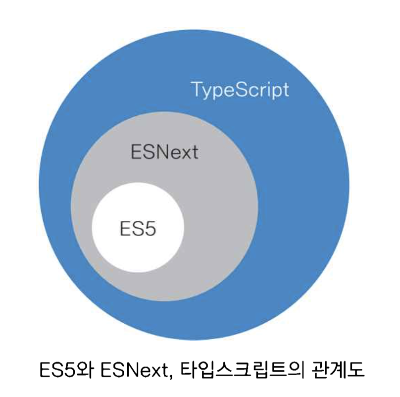 위의 관계도처럼 ESNext는 ES5의 문법을 포함하고, 타입스크립트는 ESNext의 문법을 포함하고 있다고 합니다.