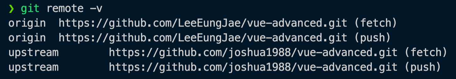- -v 옵션으로 설정된 원격 저장소를 확인해보자.